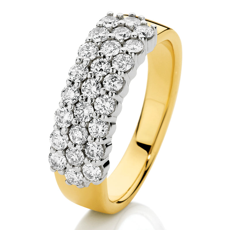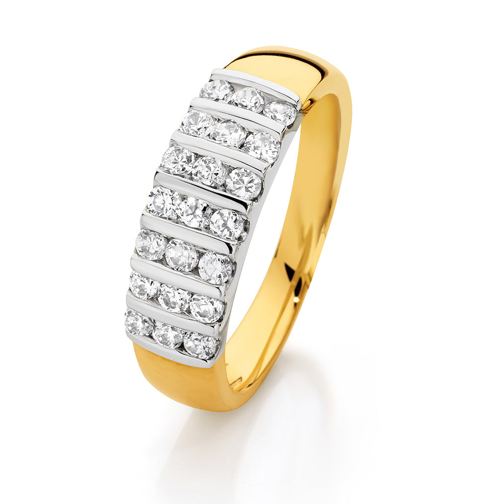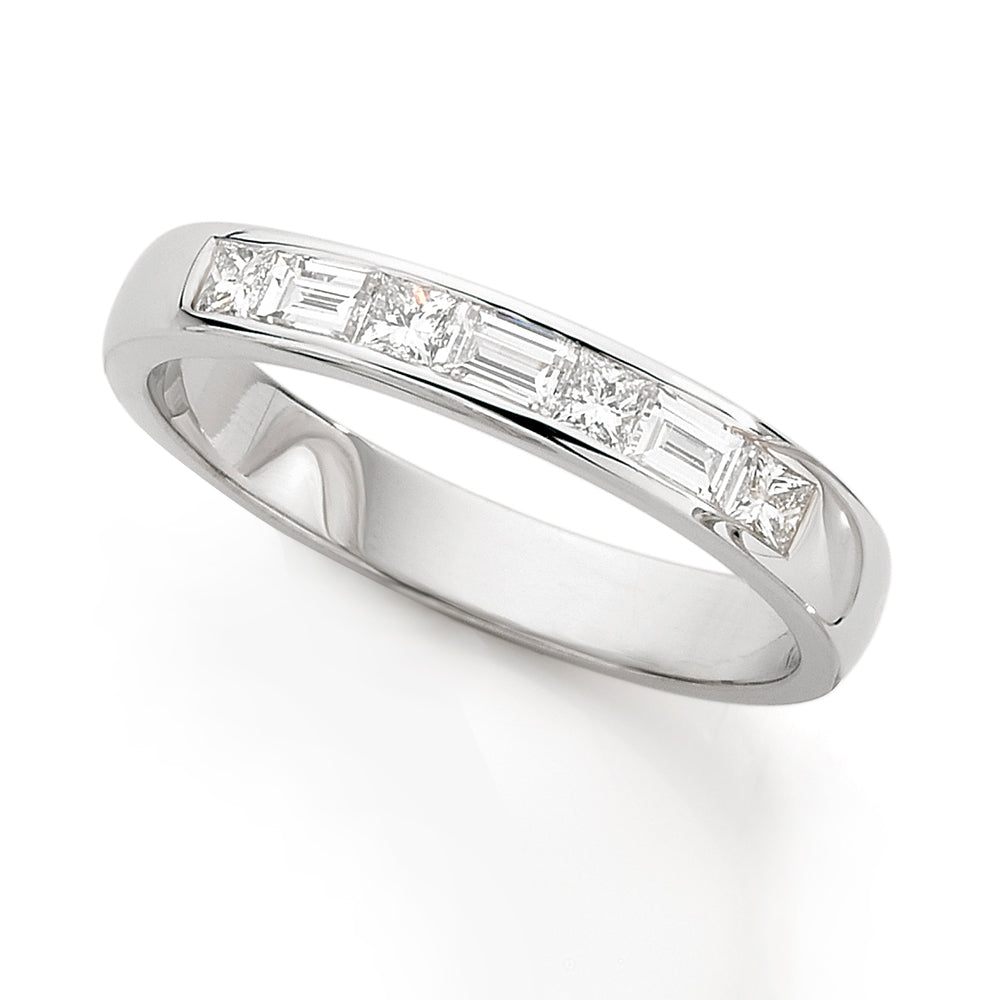 The band features smaller diamonds, typically rounds or squares and can extend all the way around the band or half way.