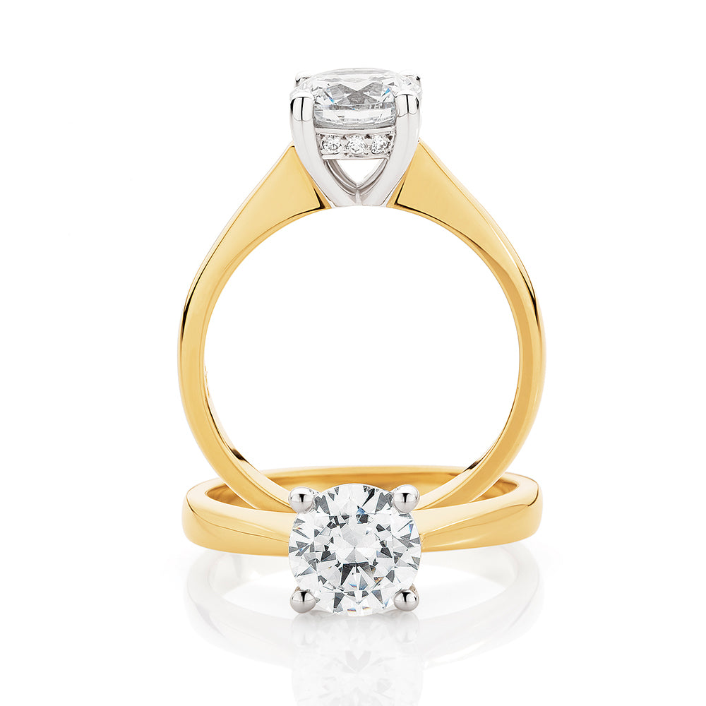Most two-tone designs are in a combination of yellow and white gold, however white gold and rose gold is becoming increasingly popular. Rose gold is ideal to highlight pink diamonds or just to add some contrast whereas white gold is used for the claws or prongs to help keep the diamond looking as white and bright as possible.
