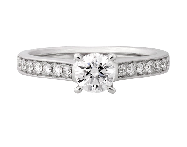 Brilliant cut diamonds are most common in these types of settings as they offer great sparkle however baguettes or squares can also be used to offer a nice contrast to the main diamond.